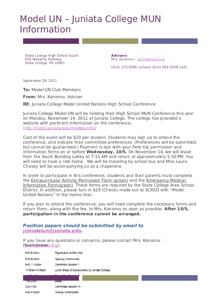 The JUNIATA MUN CONFERENCE Please ... is a Word document required to be submitted to the specific address in order to provide some information. It needs to be filled-out and signed, which can be done manually in hard copy, or using a certain software e. g. PDFfiller. It lets you fill out any PDF or Word document right in the web, customize it according to your requirements and put a legally-binding electronic signature. Once after completion, the user can easily send the JUNIATA MUN CONFERENCE Please ... to the relevant person, or multiple ones via email or fax. The template is printable too thanks to PDFfiller feature and options proposed for printing out adjustment. In both electronic and physical appearance, your form will have a neat and professional outlook. It's also possible to save it as the template to use it later, without creating a new document from the beginning. You need just to edit the ready document.