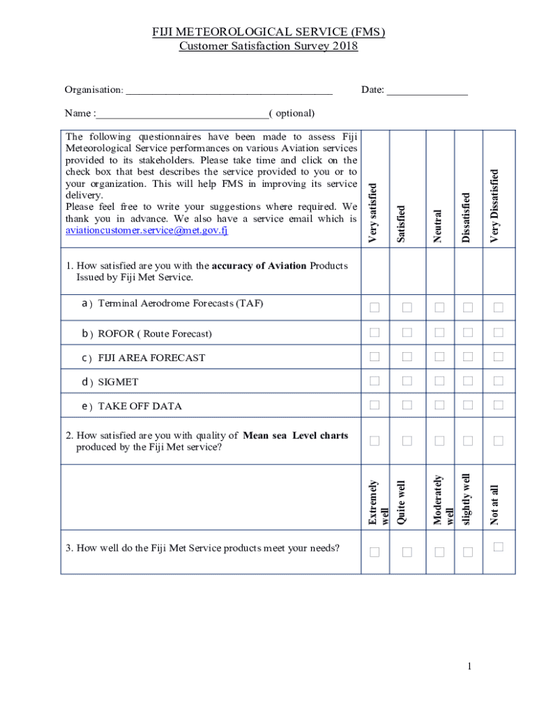 FIJI METEOROLOGICAL SERVICE (FMS) Customer Satisfaction Survey 2018Organisation: ___Date: ___DissatisfiedVery Dissatisfied Not at allNeutralModerately well slightly wellSatisfiedThe following questionnaires