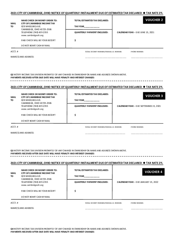 2021 CITY OF CAMBRIDGE, OHIO NOTICE OF QUARTERLY INSTALLMENT DUE OF ESTIMATED TAX DECLARED TAX RATE 2% MAIL TOMAKE CHECK OR MONEY ORDER TO: CITY OF CAMBRIDGE INCOME TAX 828 WHEELING AVE. CAMBRIDGE,
