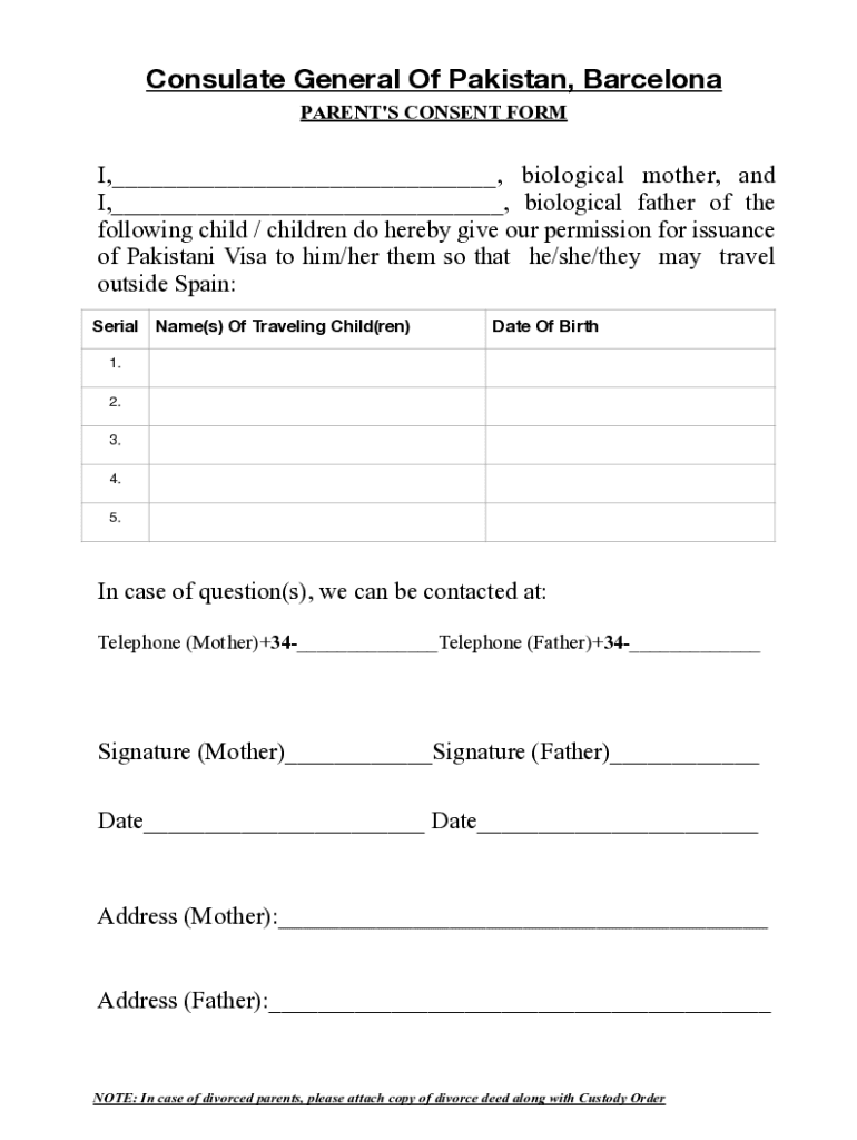 PARENT\'S CONSENT FORMI,___, biological mother, and I,___, biological father of the following child / children do hereby give our permission for issuance of Pakistani Visa to him/her them so that