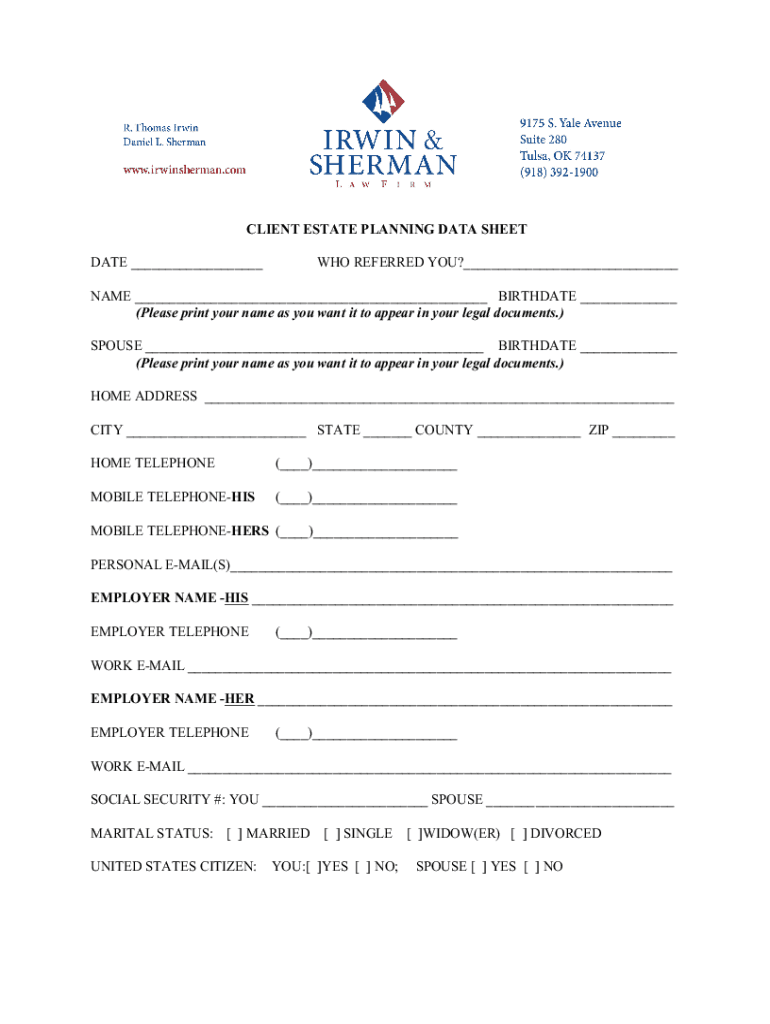CLIENT ESTATE PLANNING DATA SHEET DATE ___WHO REFERRED YOU?___NAME ___ BIRTHDATE ___ (Please print your name as you want it to appear in your legal documents.) SPOUSE ___ BIRTHDATE ___ (Please print