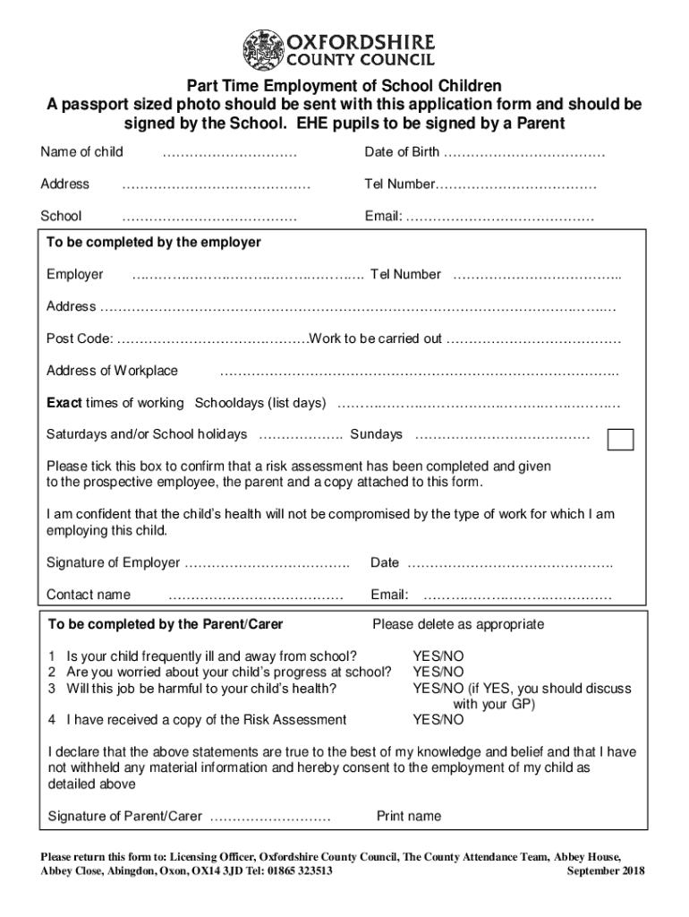 Part Time Employment of School Children A passport sized photo should be sent with this application form and should be signed by the School. THE pupils to be signed by a Parent Name of childcare of