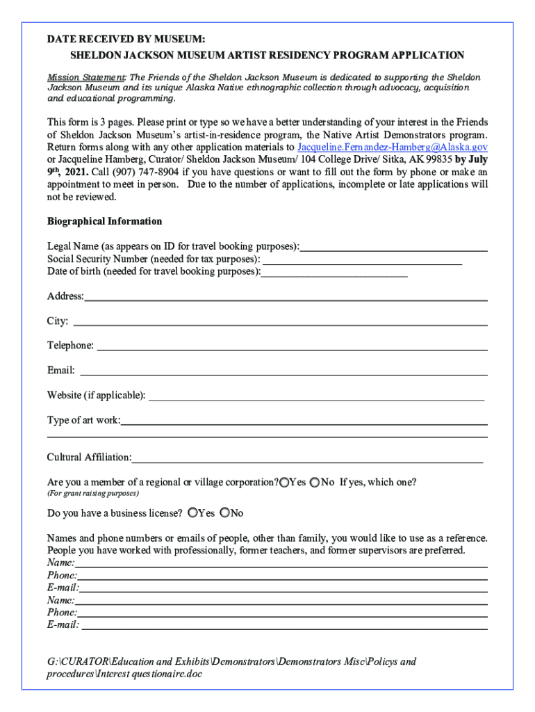 DATE RECEIVED BY MUSEUM: SHELDON JACKSON MUSEUM ARTIST RESIDENCY PROGRAM APPLICATION Mission Statement: The Friends of the Sheldon Jackson Museum is dedicated to supporting the Sheldon Jackson Museum
