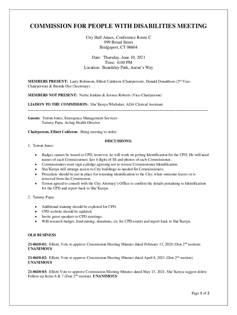 COMMISSION FOR PEOPLE WITH DISABILITIES MEETING City Hall Annex, Conference Room C 999 Broad Street Bridgeport, CT 06604 Date: Thursday, June 10, 2021 Time: 6:00 PM Location: Beardsley Park, Aarons
