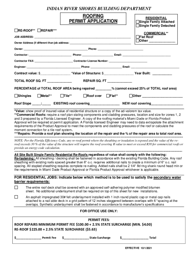 INDIAN RIVER SHORES BUILDING DEPARTMENT ROOFING PERMIT APPLICATION REROOF**RESIDENTIAL Single Family Attached Single Family DetachedREPAIR***JOB ADDRESS: ___ Owner Address (if different than job address: