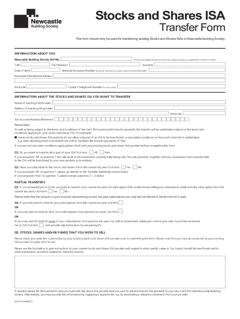 Stocks and Shares Transfer Forms form should only be used for transferring existing Stocks and Shares ISA's to Newcastle Building Society. INFORMATION ABOUT YOU