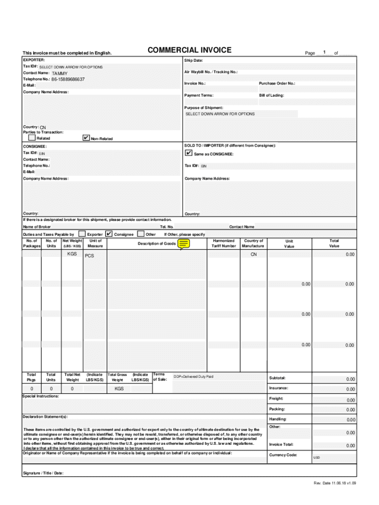 COMMERCIAL Invoices invoice must be completed in English. EXPORTER:Ship Date:Tax ID#: SELECT DOWN ARROW FOR OPTIONS Contact Name: Tammy Waybill No. / Tracking No.:1 Page ___ of ___Telephone No.: 8615889686637
