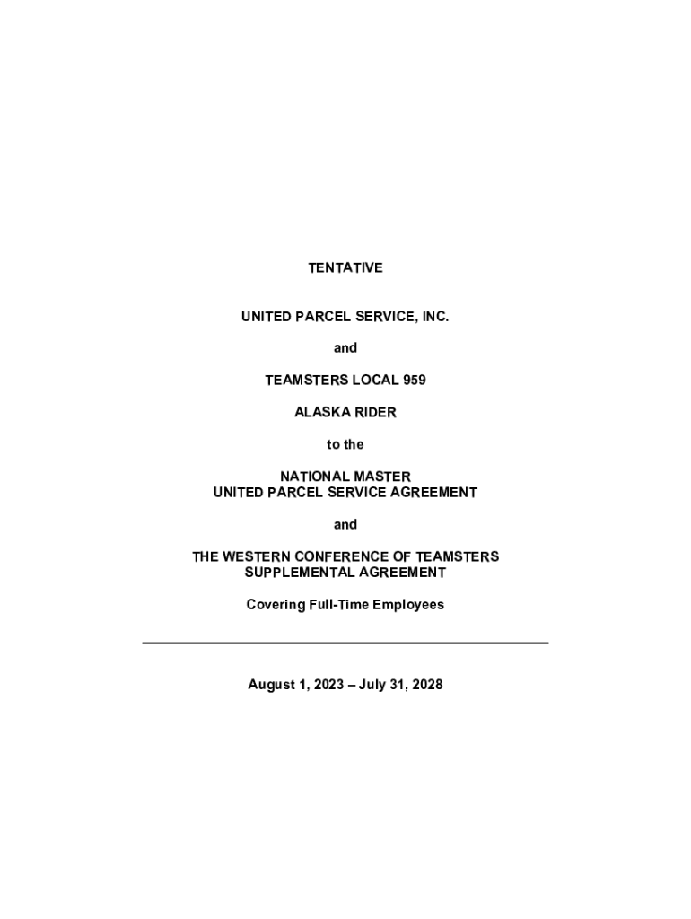TENTATIVE UNITED PARCEL SERVICE, INC. and TEAMSTERS LOCAL 959 ALASKA RIDER to the NATIONAL MASTER UNITED PARCEL SERVICE AGREEMENT and THE WESTERN CONFERENCE OF TEAMSTERS SUPPLEMENTAL AGREEMENT Covering
