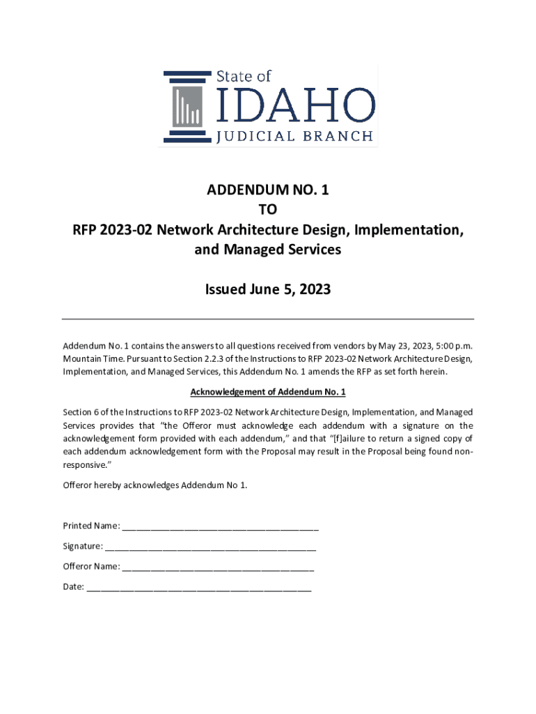 ADDENDUM NO. 1 TO RFP 202302 Network Architecture Design, Implementation, and Managed Services Issued June 5, 2023 Addendum No. 1 contains the answers to all questions received from vendors by May