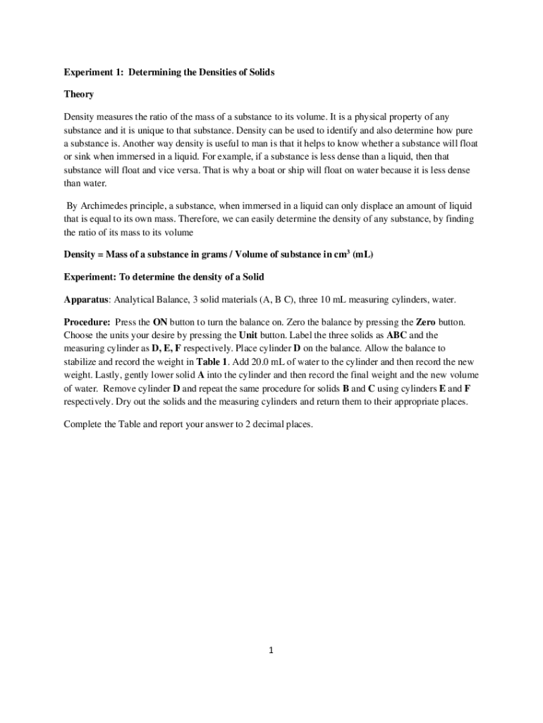 Experiment 1: Determining the Densities of Solids Theory Density measures the ratio of the mass of a substance to its volume. It is a physical property of any substance and it is unique to that substance.