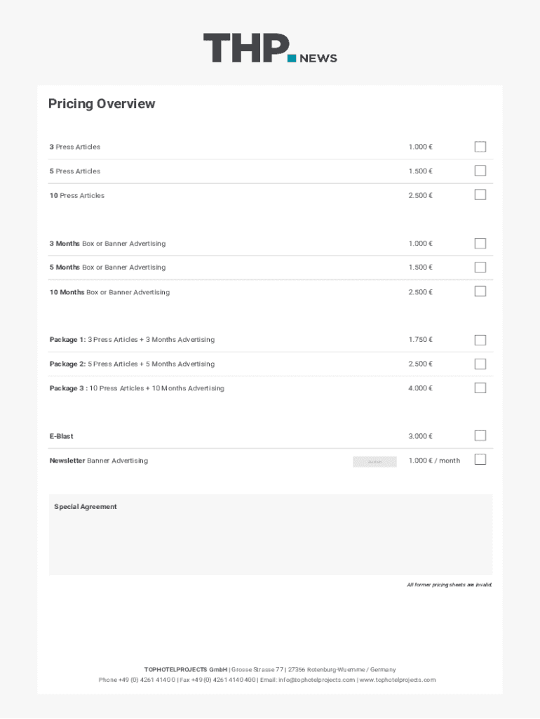Pricing Overview 3 Press Articles1.000 5 Press Articles1.500 10 Press Articles2.500 3 Months Box or Banner Advertising1.000 5 Months Box or Banner Advertising1.500 10 Months Box or Banner Advertising2.500