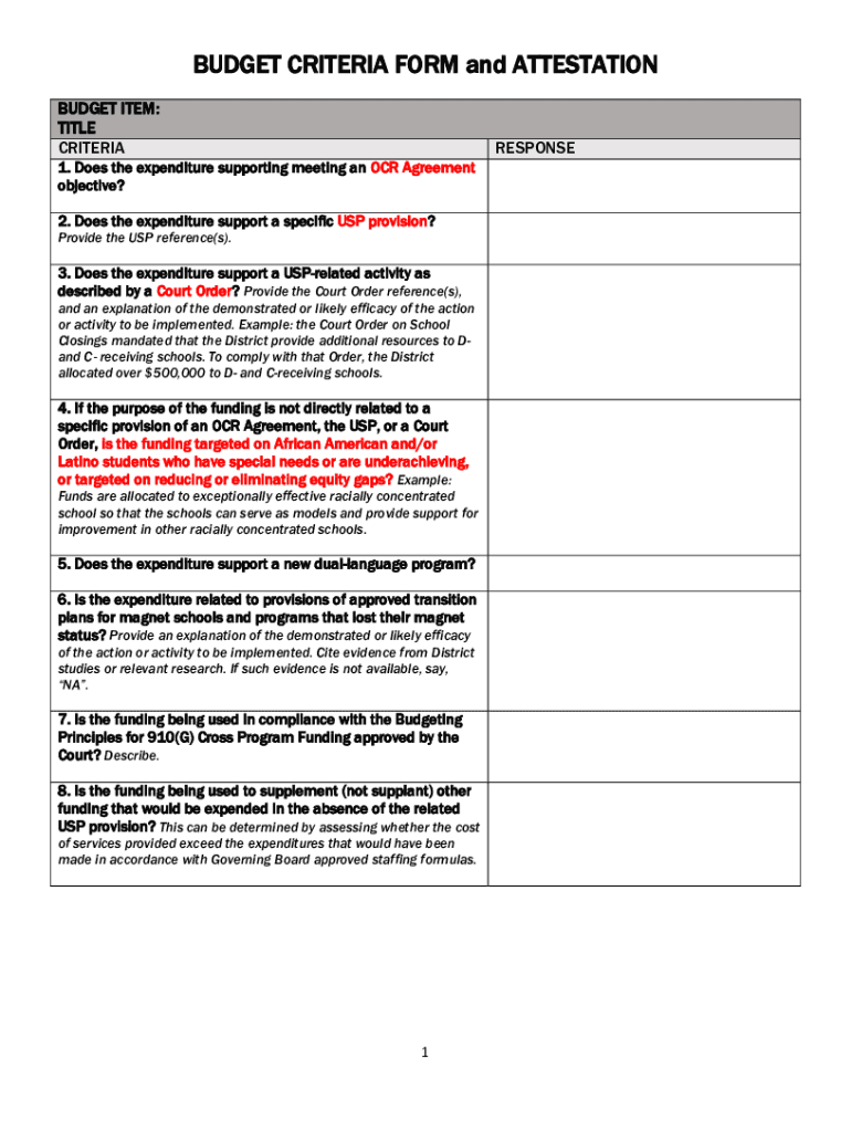 BUDGET CRITERIA FORM and ATTESTATION BUDGET ITEM: TITLE CRITERIA1. Does the expenditure supporting meeting an OCR Agreement objective? 2. Does the expenditure support a specific USP provision? Provide