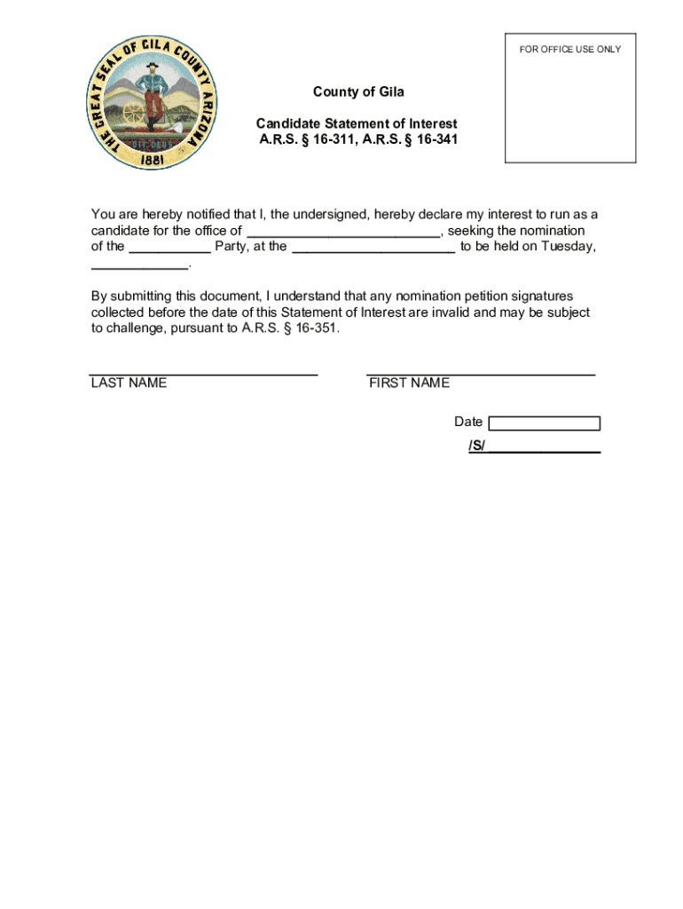 FOR OFFICE USE ONLYCounty of Gila Candidate Statement of Interest A.R.S. 16311, A.R.S. 16341YouareherebynotifiedthatI,theundersigned,herebydeclaremyinteresttorunasa candidatefortheofficeof___,seekingthenomination