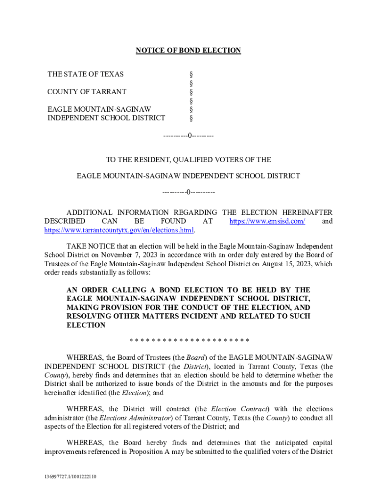 NOTICE OF BOND ELECTION THE STATE OF TEXAS COUNTY OF TARRANT EAGLE MOUNTAINSAGINAW INDEPENDENT SCHOOL DISTRICT 0TO THE RESIDENT, QUALIFIED VOTERS OF THE EAGLE MOUNTAINSAGINAW INDEPENDENT SCHOOL DISTRICT