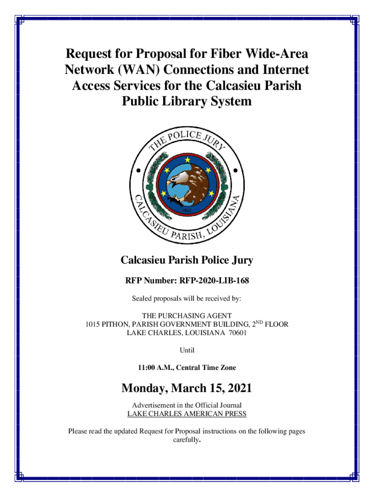 Request for Proposal for Fiber WideArea Network (WAN) Connections and Internet Access Services for the Calcasieu Parish Public Library SystemCalcasieu Parish Police Jury RFP Number: RFP2020LIB168