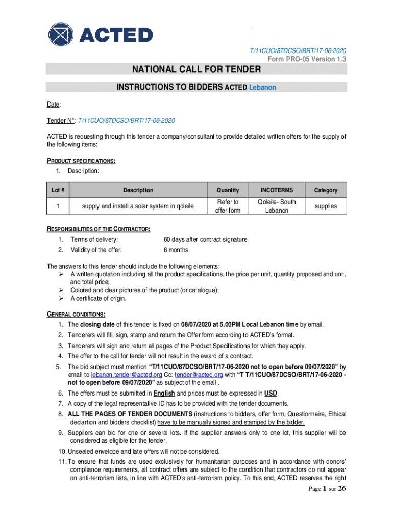 T/11CUO/87DCSO/BRT/17062020NATIONAL CALL FOR Tenderfoot PRO05 Version 1.3INSTRUCTIONS TO BIDDERS ACTED Lebanon