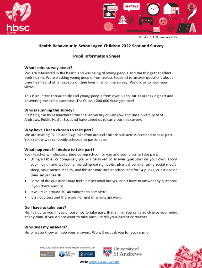 Version 1.1 27 January 2022Health Behaviour in Schoolaged Children 2022 Scotland Survey Pupil Information Sheet What is the survey about? We are interested in the health and wellbeing of young people