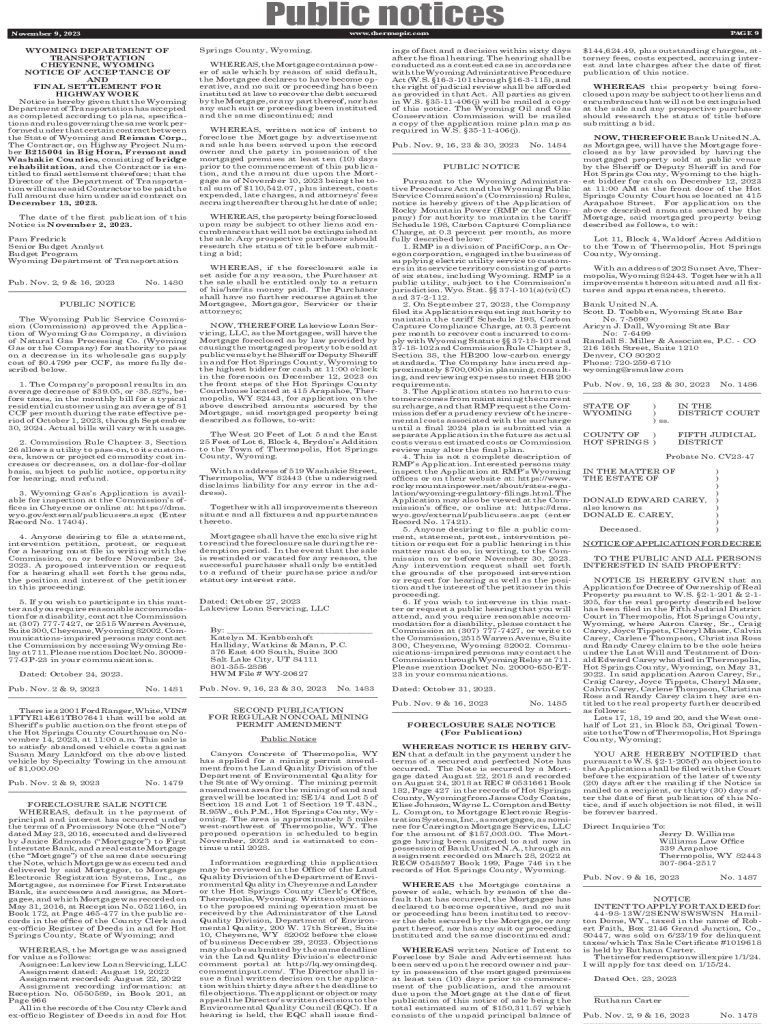 Public notices www.thermopir.comNovember 9, 2023WYOMING DEPARTMENT OF TRANSPORTATION CHEYENNE, WYOMING NOTICE OF ACCEPTANCE OF AND FINAL SETTLEMENT FOR HIGHWAY WORK Notice is hereby given that the