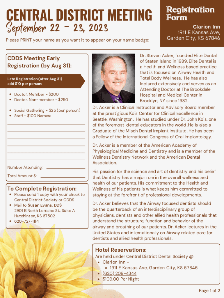 CENTRAL DISTRICT MEETING September 22 23, 2023Please PRINT your name as you want it to appear on your name badge:CDDS Meeting Early Registration (by Aug 31): Late Registration (after Aug 31) add $10