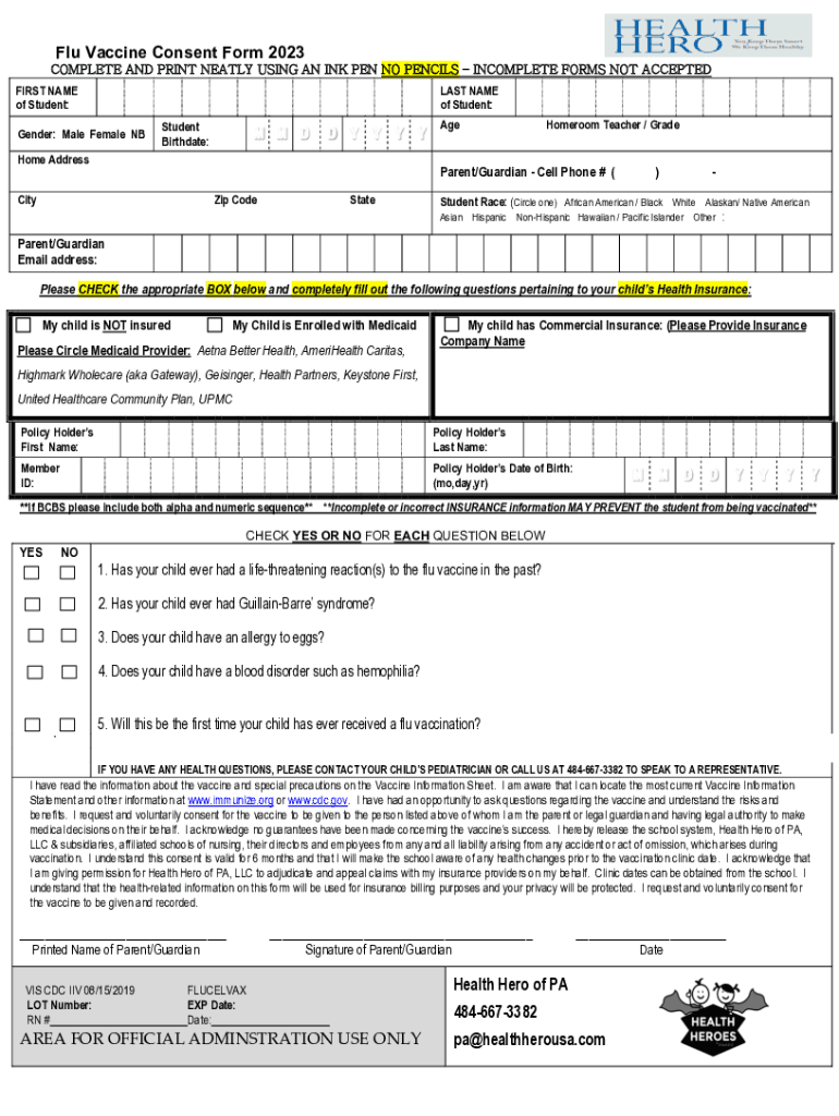 Get the free Influenza (Flu) Vaccine Consent Form 2023
