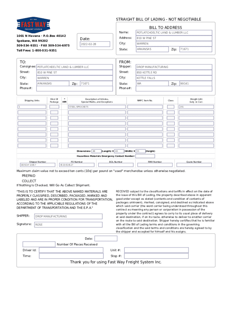 STRAIGHT BILL OF LADING NOT NEGOTIABLE