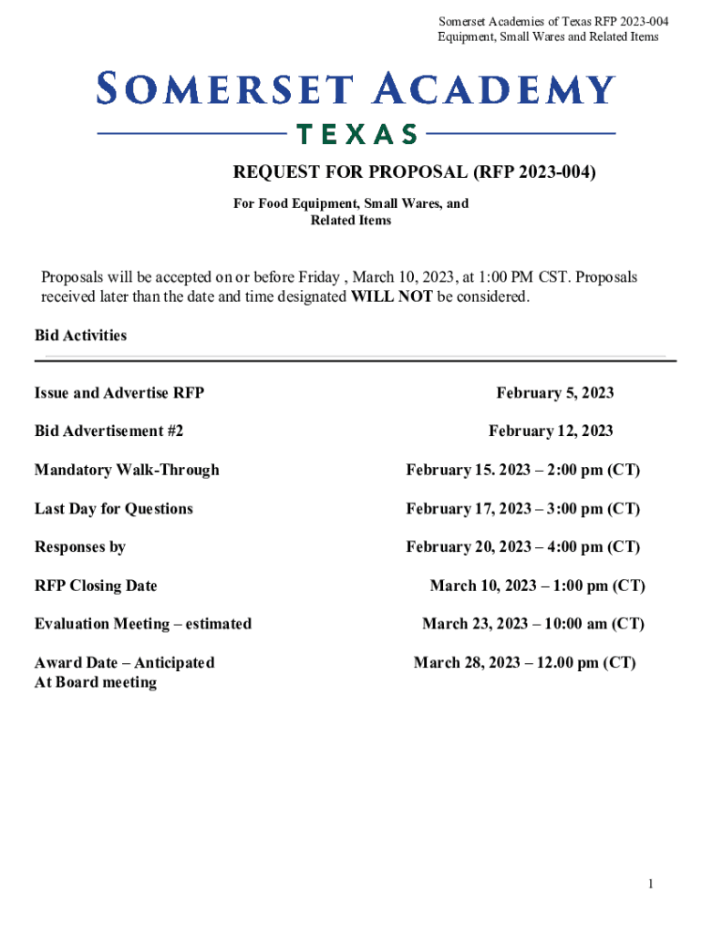 Somerset Academies of Texas RFP 2023004 Equipment, Small Wares and Related ItemsREQUEST FOR PROPOSAL (RFP 2023004) For Food Equipment, Small Wares, and Related ItemsProposals will be accepted on or