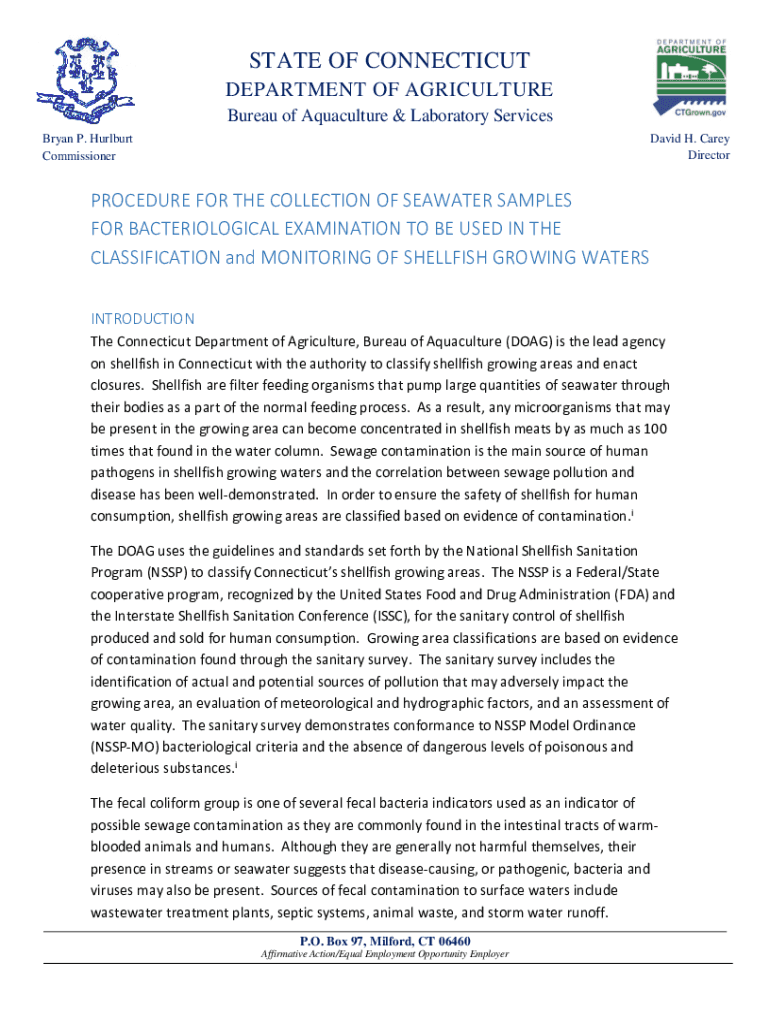 STATE OF CONNECTICUT DEPARTMENT OF AGRICULTURE Bureau of Aquaculture & Laboratory Services David H. Carey DirectorBryan P. Hurlburt CommissionerPROCEDURE FOR THE COLLECTION OF SEAWATER SAMPLES FOR