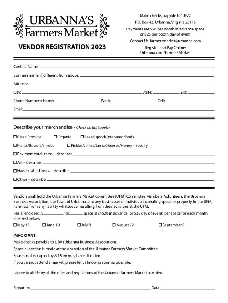 Contact Us: farmersmarket@urbanna.comVENDOR REGISTRATION 2023Register