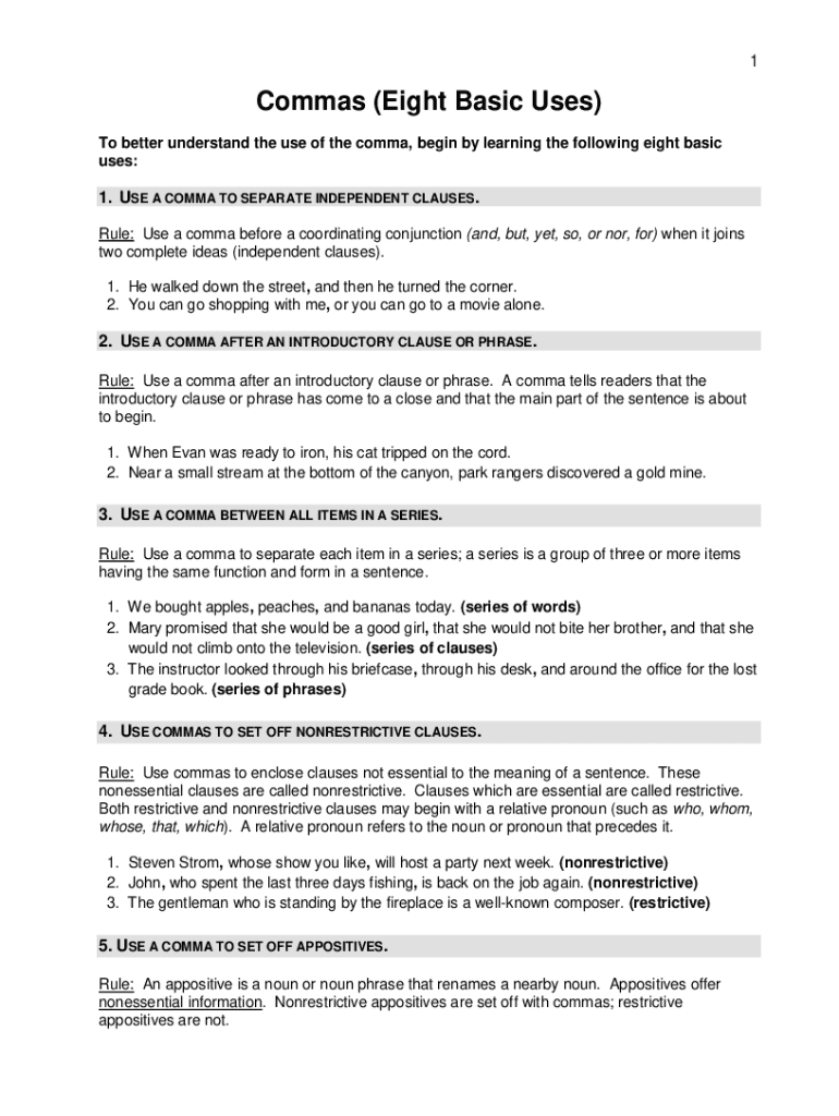 1Commas (Eight Basic Uses) To better understand the use of the comma, begin by learning the following eight basic uses:1. USE A COMMA TO SEPARATE INDEPENDENT CLAUSES. Rule: Use a comma before a coordinating