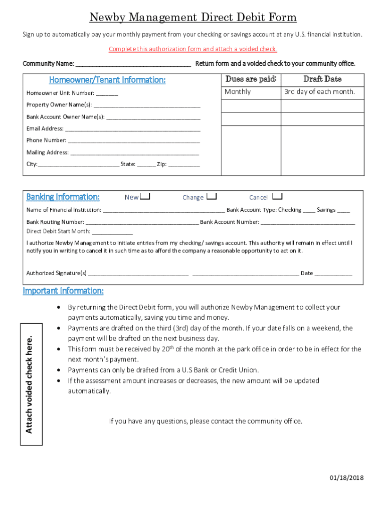 Newby Management Direct Debit Form Sign up to automatically pay your monthly payment from your checking or savings account at any U.S. financial institution. Complete this authorization form and attach