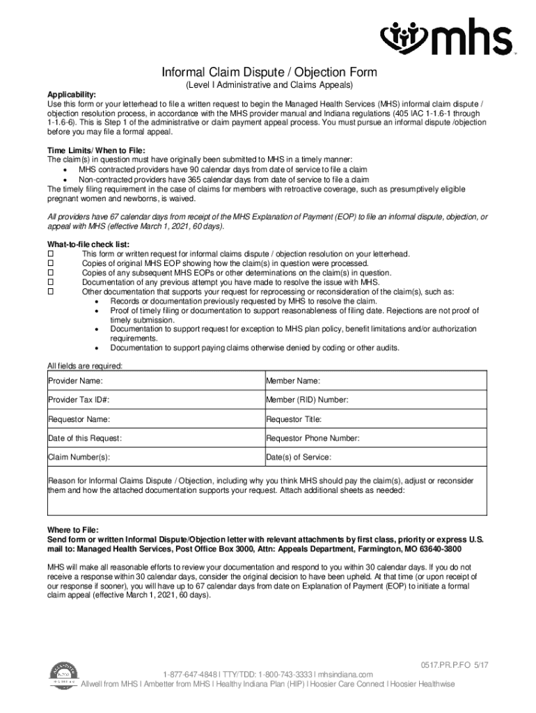 Informal Claim Dispute / Objection Form (Level I Administrative and Claims Appeals) Applicability: Use this form or your letterhead to file a written request to begin the Managed Health Services (MHS)