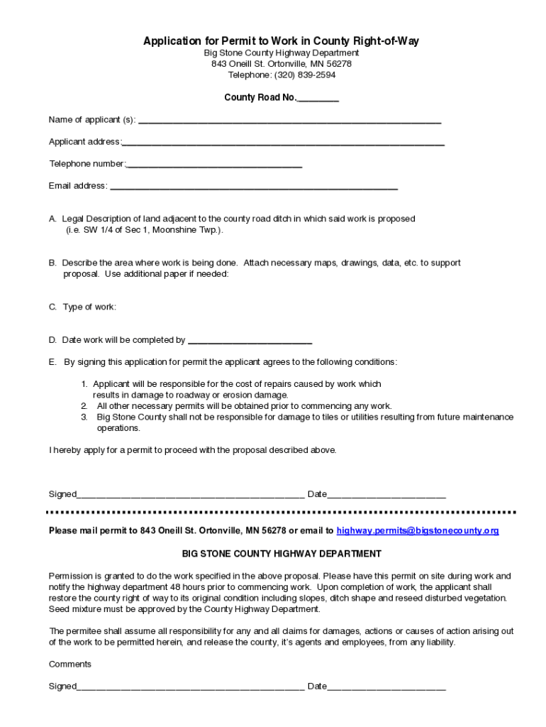 Application for Permit working in County RightofWay Big Stone County Highway Department 843 O'Neill St. Eatonville, MN 56278 Telephone: (320) 8392594 County Road No. ___ Name of applicant (s): ___