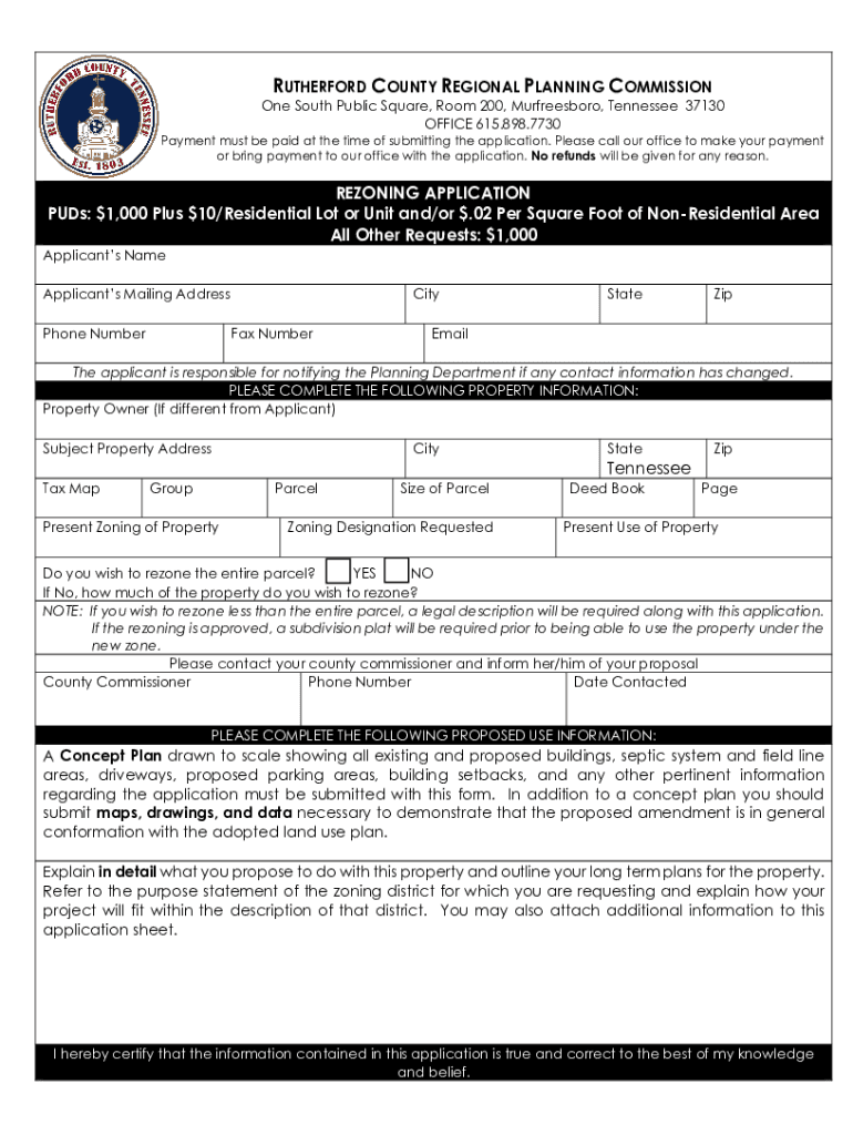 RUTHERFORD COUNTY REGIONAL PLANNING COMMISSIONOne South Public Square, Room 200, Murfreesboro, Tennessee 37130 OFFICE 615.898.7730 Payment must be paid at the time of submitting the application. Please