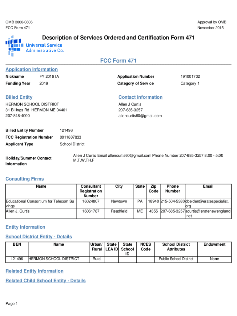 OMB 30600806 FCC Form 471Approval by OMB November 2015Description of Services Ordered and Certification Form 471FCC Form 471 Application Information Nickname FY 2019 Application Number191001702Funding