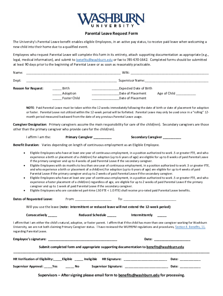 Parental Leave Request Form The Universities Parental Leave benefit enables eligible Employees, in an active pay status, to receive paid leave when welcoming a new child into their home due to a qualified