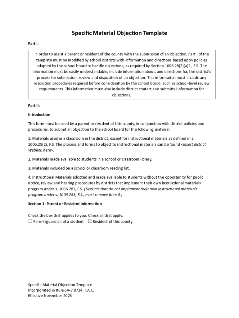 The specific material objection template typically requires the name and contact information of the filer, a description of the material being contested, the basis for the objection, and any supporting evidence or documentation.