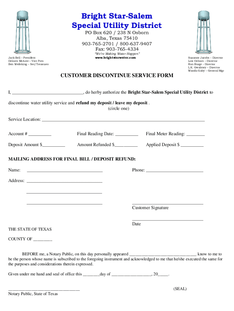 Bright StarSalem Special Utility District PO Box 620 / 238 N Osborn Alba, Texas 75410 9037652701 / 8006379407 Fax: 9037654334 Were Making Water Happen www.brightstarwater.comJack Bell President Delores