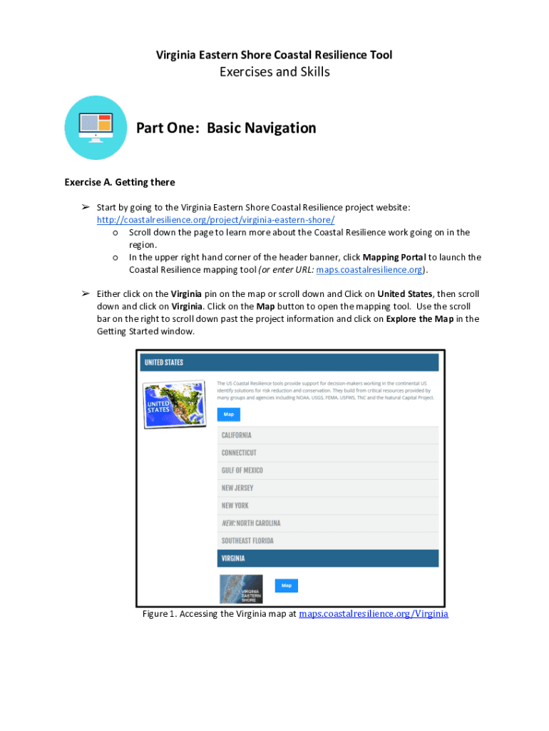 VirginiaEasternShoreCoastalResilienceToolExercisesandSkillsPartOne:BasicNavigationExerciseA.Gettingthere StartbygoingtotheVirginiaEasternShoreCoastalResilienceprojectwebsite: http://coastalresilience.org/project/virginiaeasternshore/
