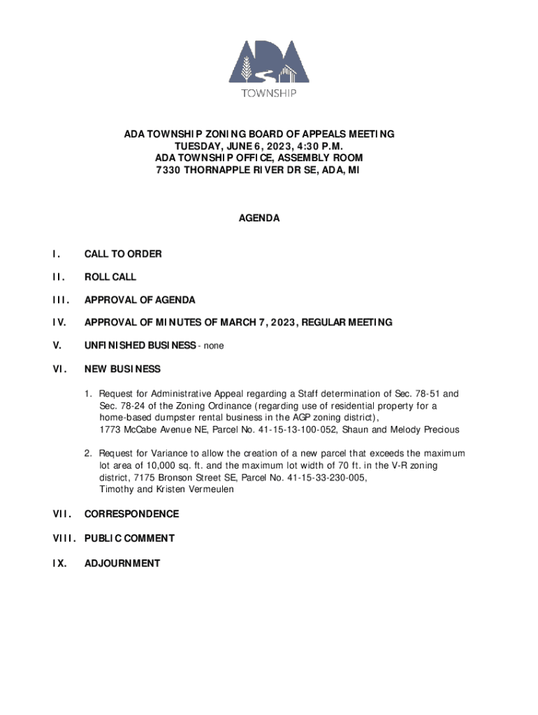 ADA TOWNSHIP ZONING BOARD OF APPEALS MEETING TUESDAY, JUNE 6, 2023, 4:30 P.M. ADA TOWNSHIP OFFICE, ASSEMBLY ROOM 7330 THORNAPPLE RIVER DR SE, ADA, AGENDA I.CALL TO ORDER.ROLL CALLING.APPROVAL OF AGENDA