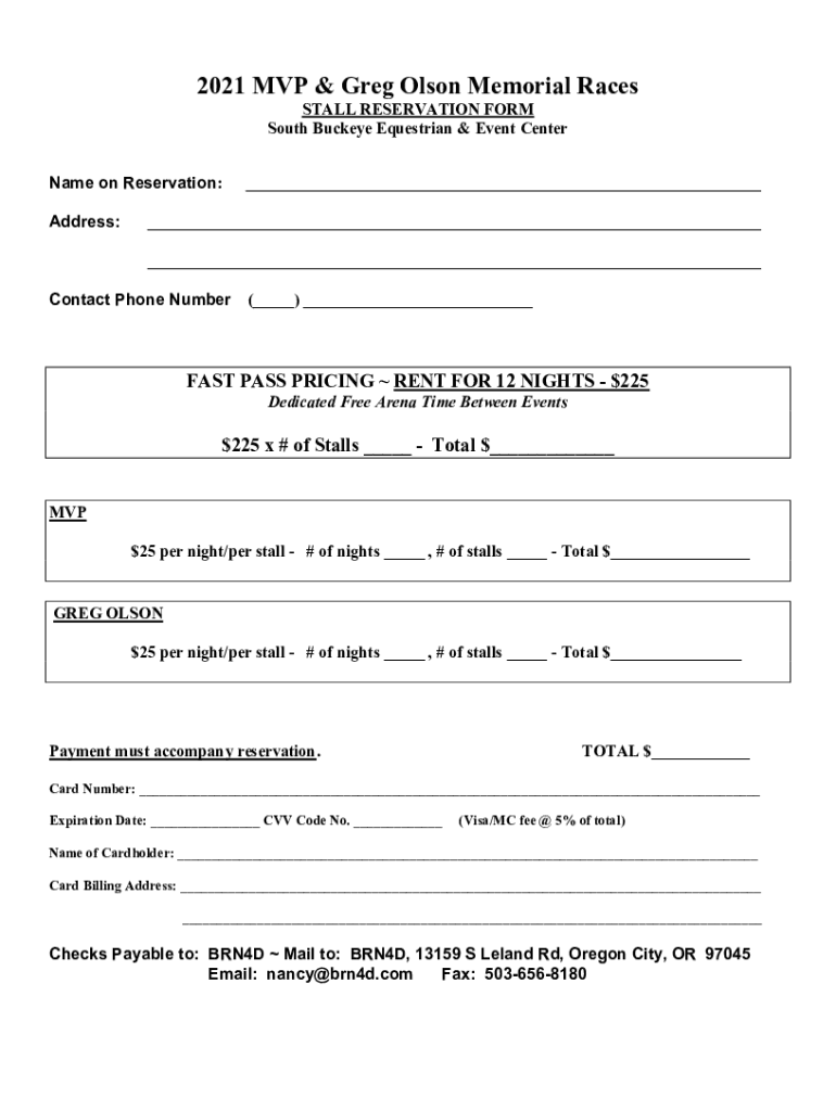 2021 MVP & Greg Olson Memorial Races STALL RESERVATION FORM South Buckeye Equestrian & Event Center Name on Reservation: Address:______ ___Contact Phone Number(___) ___FAST PASS PRICING RENT FOR 12