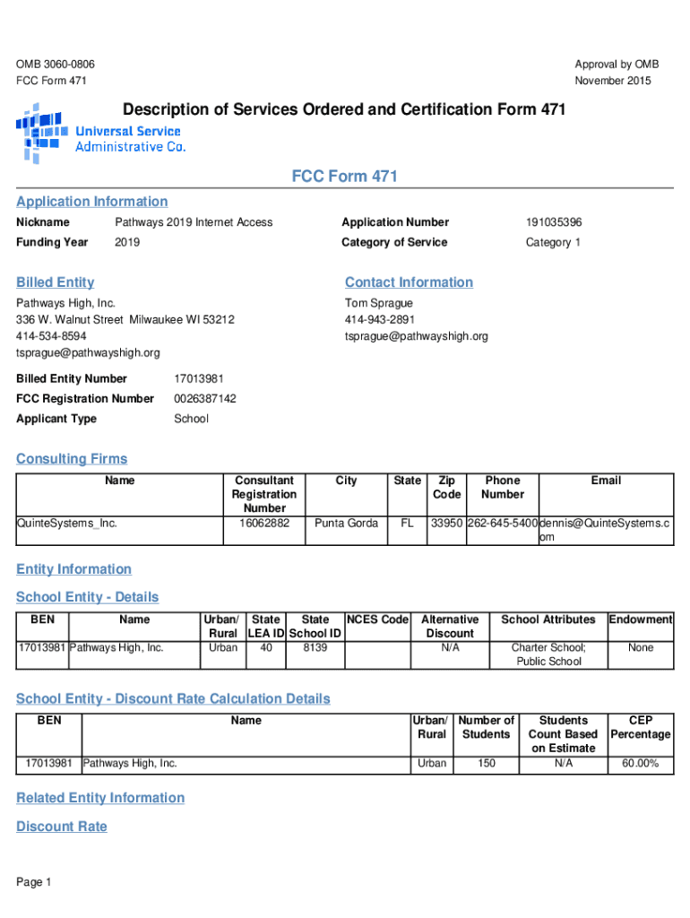 OMB 30600806 FCC Form 471Approval by OMB November 2015Description of Services Ordered and Certification Form 471FCC Form 471 Application Information NicknamePathways 2019 Internet AccessApplication
