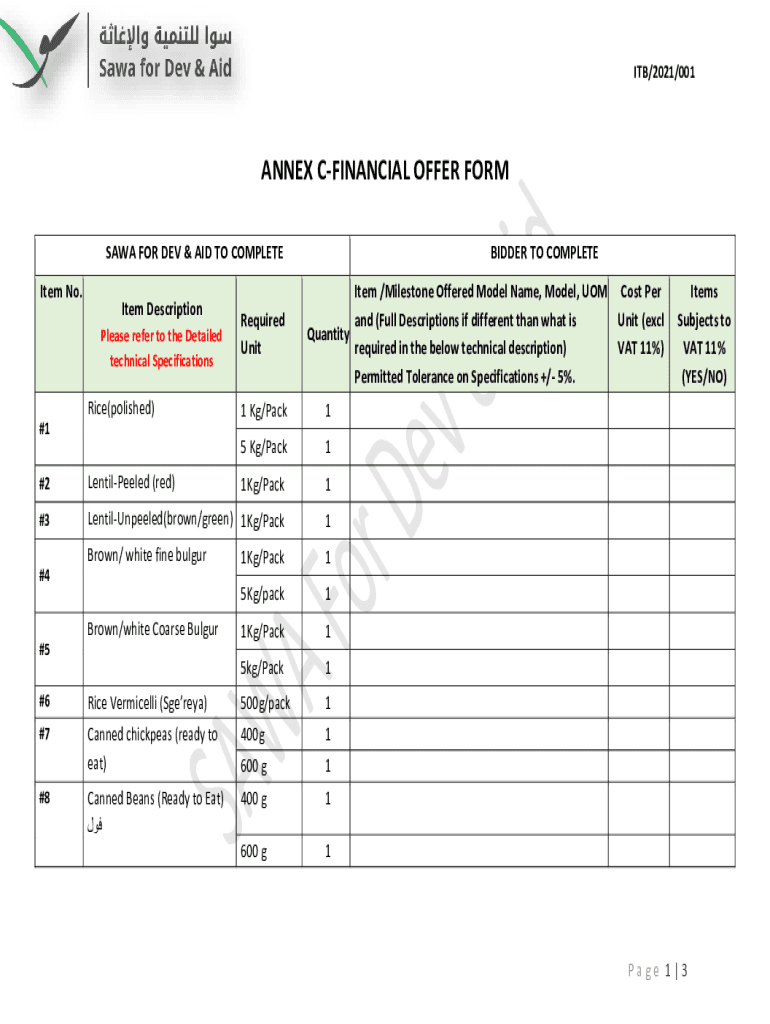 ITB/2021/001ANNEX FINANCIAL OFFER FORM SAW FOR DEV & AID TO COMPLETE Item No. Item Description Please refer to the Detailed technical Specifications Rice(polished) #1Required Unbidden TO COMPLETE