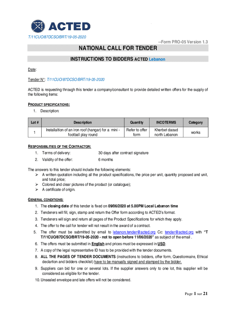 T/11CUO/87DCSO/BRT/19052020NATIONAL CALL FOR Tenderfoot PRO05 Version 1.3INSTRUCTIONS TO BIDDERS ACTED Lebanon Date: Tender N: T/11CUO/87DCSO/BRT/19052020 ACTED is requesting through this tender a