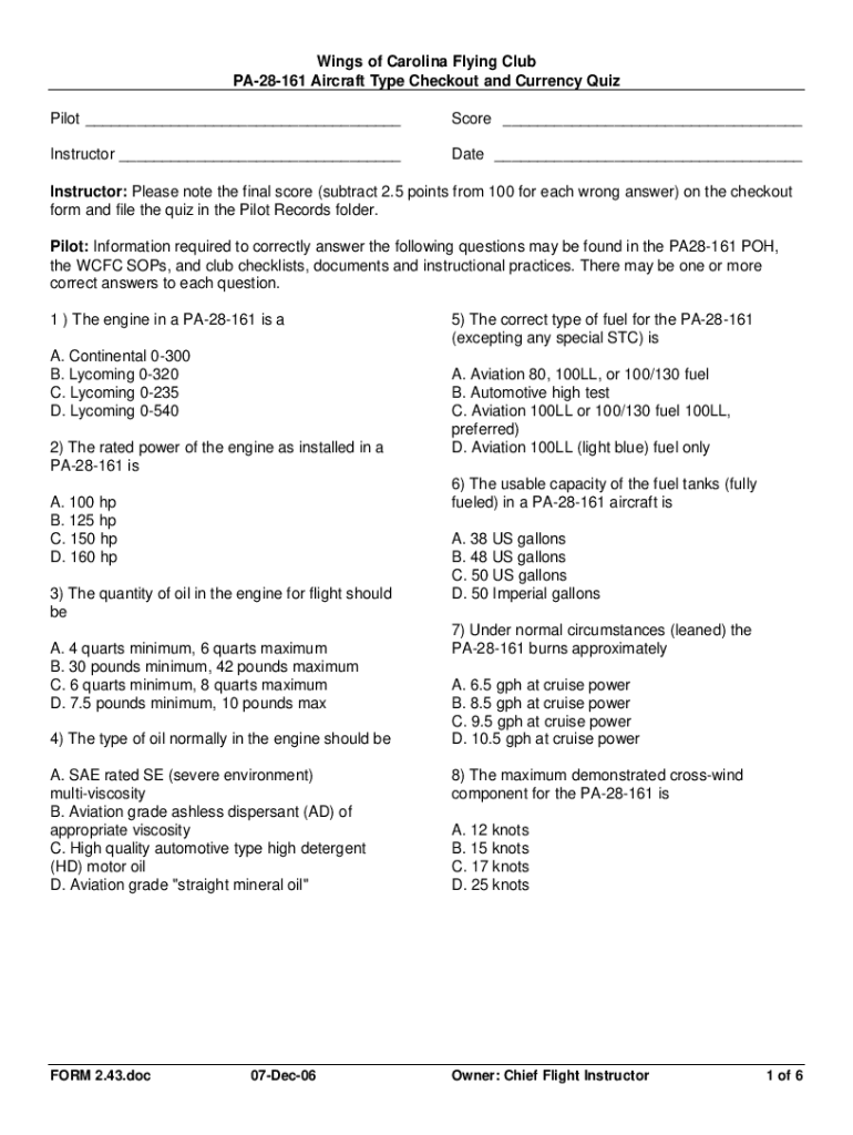 Wings of Carolina Flying Club PA28161 Aircraft Type Checkout and Currency Quiz Pilot ___Score ___Instructor ___Date ___Instructor: Please note the final score (subtract 2.5 points from 100 for each