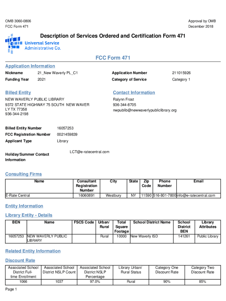 OMB 30600806 FCC Form 471Approval by OMB December 2018Description of Services Ordered and Certification Form 471FCC Form 471 Application Information Nickname21_New Waverley PL_C1Application Number211015926Funding