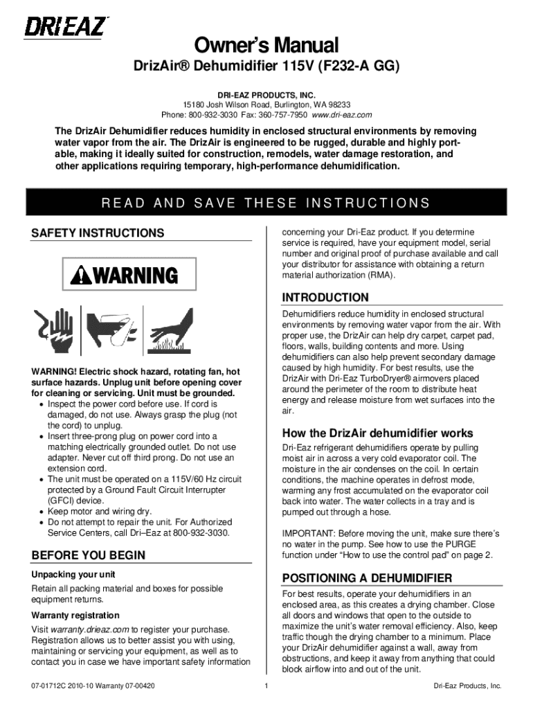 Owners Manual DrizAir Dehumidifier 115V (F232A GG) DRIEAZ PRODUCTS, INC. 15180 Josh Wilson Road, Burlington, WA 98233 Phone: 8009323030 Fax: 3607577950 www.drieaz.comThe DrizAir Dehumidifier reduces