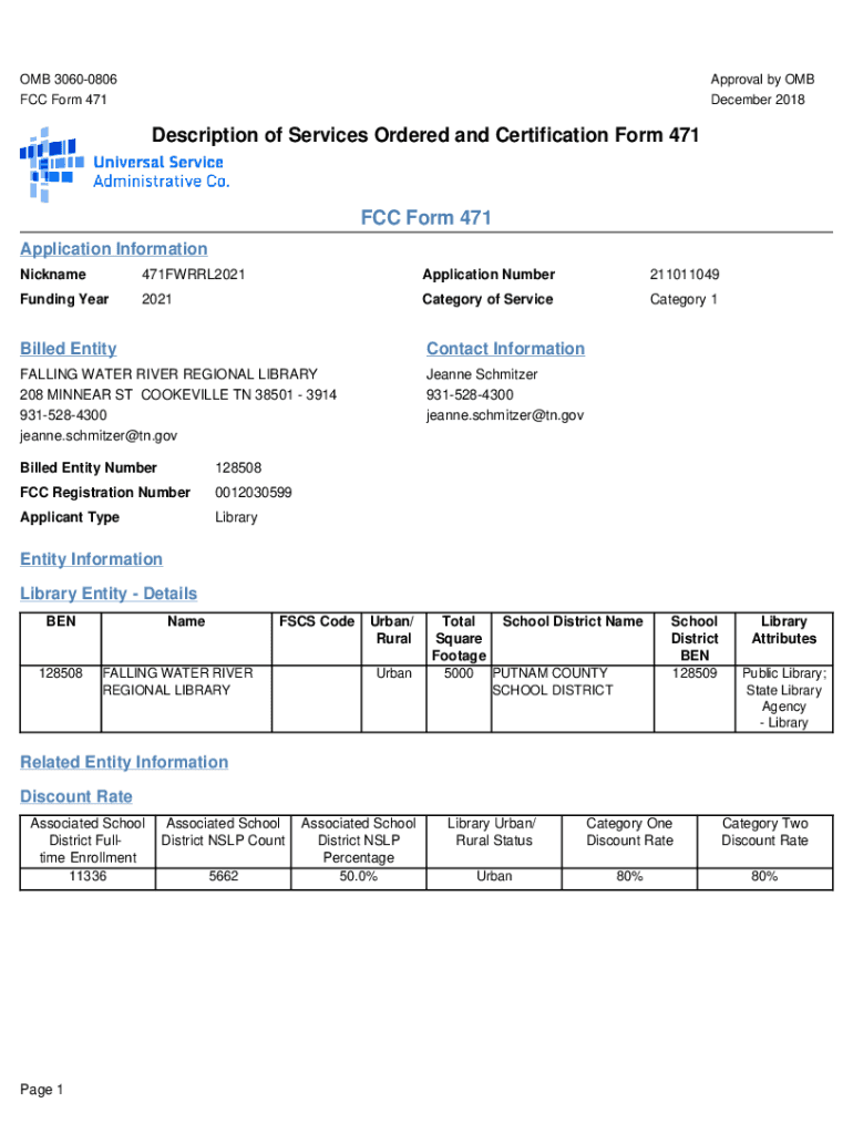 OMB 30600806 FCC Form 471Approval by OMB December 2018Description of Services Ordered and Certification Form 471FCC Form 471 Application Information Nickname471FWRRL2021Application Number211011049Funding
