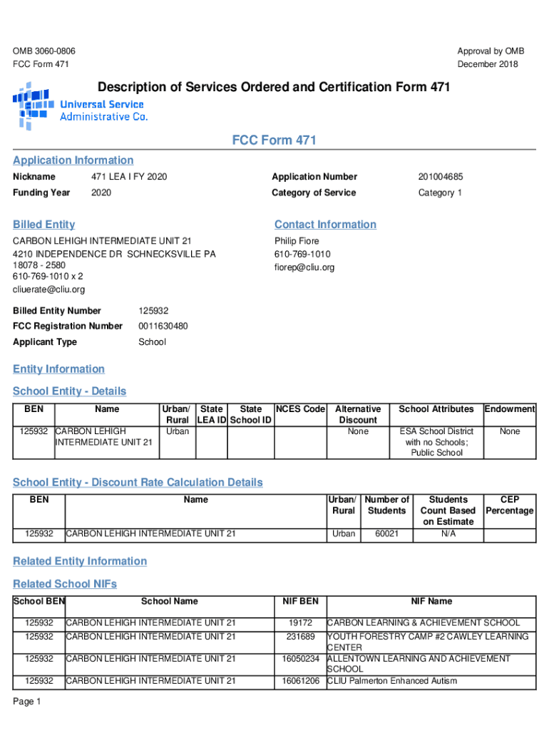 December 2018Description of Services Ordered and Certification Form 471FCC Form 471
