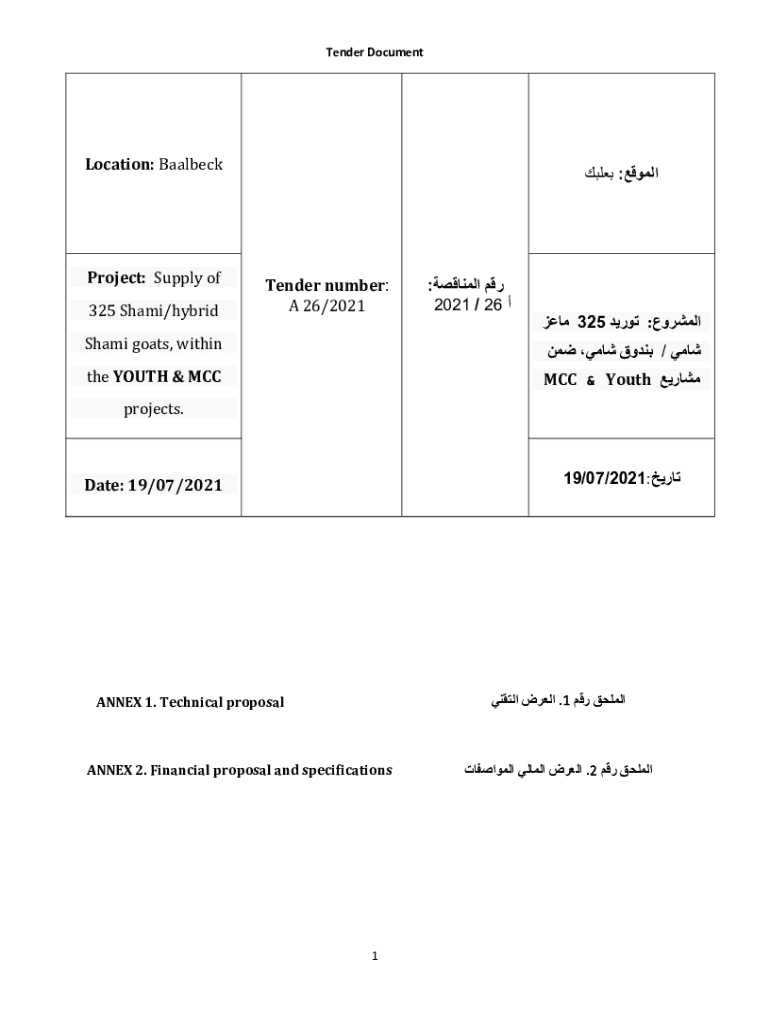 TenderDocumentLocation: BaalbeckProject:Supply of 325 Shami/hybrid :Tender number:A 26/2021: 2021 / 26 Shami goats, within 325 : / the YOUTH & MCC MCC & Youth projects.19/07/2021:Date: 19/07/2021