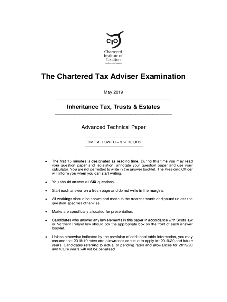 The Chartered Tax Adviser Examination May 2019 ___Inheritance Tax, Trusts & Estates ___Advanced Technical Paper TIME ALLOWED 3 House first 15 minutes is designated as reading time. During this time